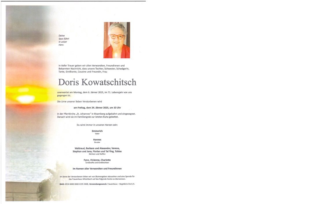 Ich habe mit Doris gemeinsam maturiert. Seither habe ich sie nur wenige Male beim Maturatreffen gesehen. Doris war in der Schule eine sehr gerade und positiv eingestellte Person. Sie hatte viel Energie, konnte sehr lustig sein. So behalte ich sie in guter Erinnerung und darf Ihnen mein Beileid ausdrücken.