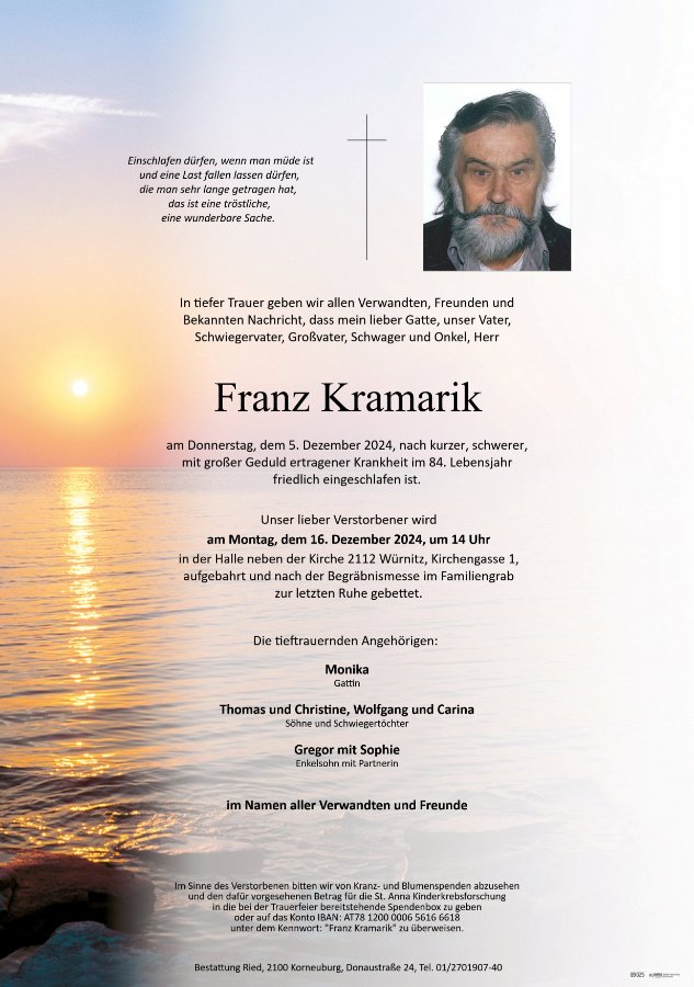 wir wünschen Ihnen von Herzen viel Kraft, dass Sie Menschen um sich haben, die Ihnen in dieser schweren Zeit beistehen und Halt geben. Zusätzlich können Sie auf dieser Gedenkseite Erinnerungen teilen und so das Andenken gemeinsam wachhalten.