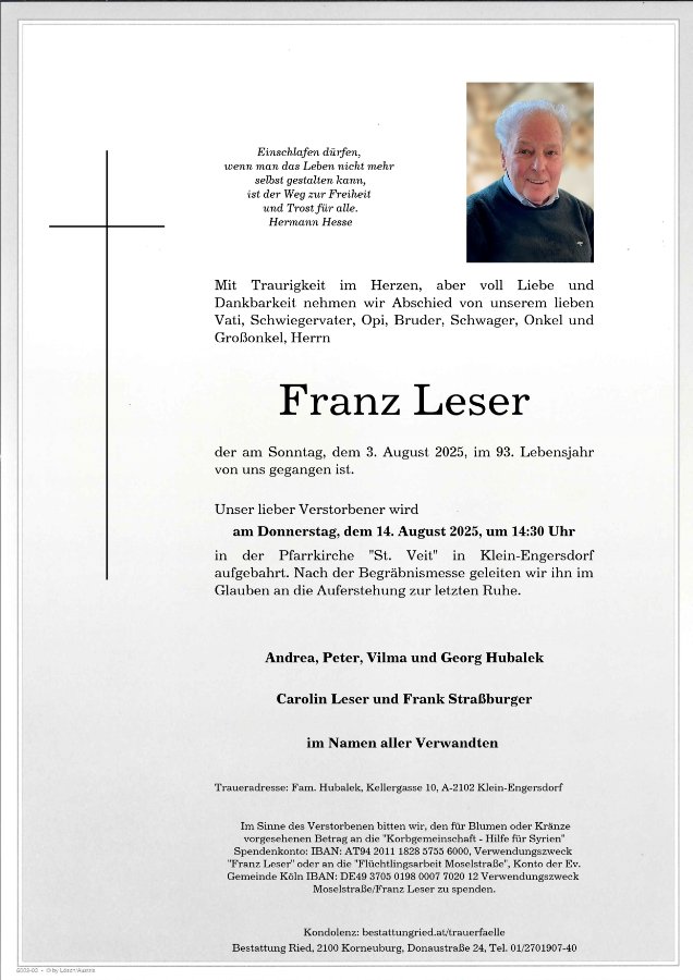 Liebe Angehörige und Freunde von Herrn Leser,