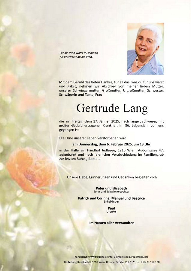 wir wünschen Ihnen von Herzen viel Kraft, dass Sie Menschen um sich haben, die Ihnen in dieser schweren Zeit beistehen und Halt geben. Zusätzlich können Sie auf dieser Gedenkseite Erinnerungen teilen und so das Andenken gemeinsam wachhalten.
