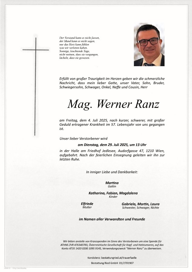 Auch, wenn sich keiner heute vorstellen kann, dass es wieder heller wird, es werden wieder gute Tage kommen - und Werner würde das genau so wollen. In euren Herzen wird er dabei sein und sich freuen, wenn ihr wieder schöne Momente erlebt.